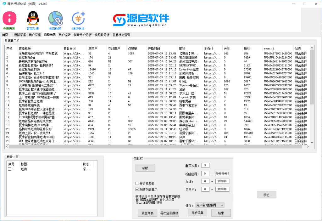 3.直播采集,可以批量通过关键词采集正在直播的直播间,可以筛选粉丝数,在线用户,和总用户