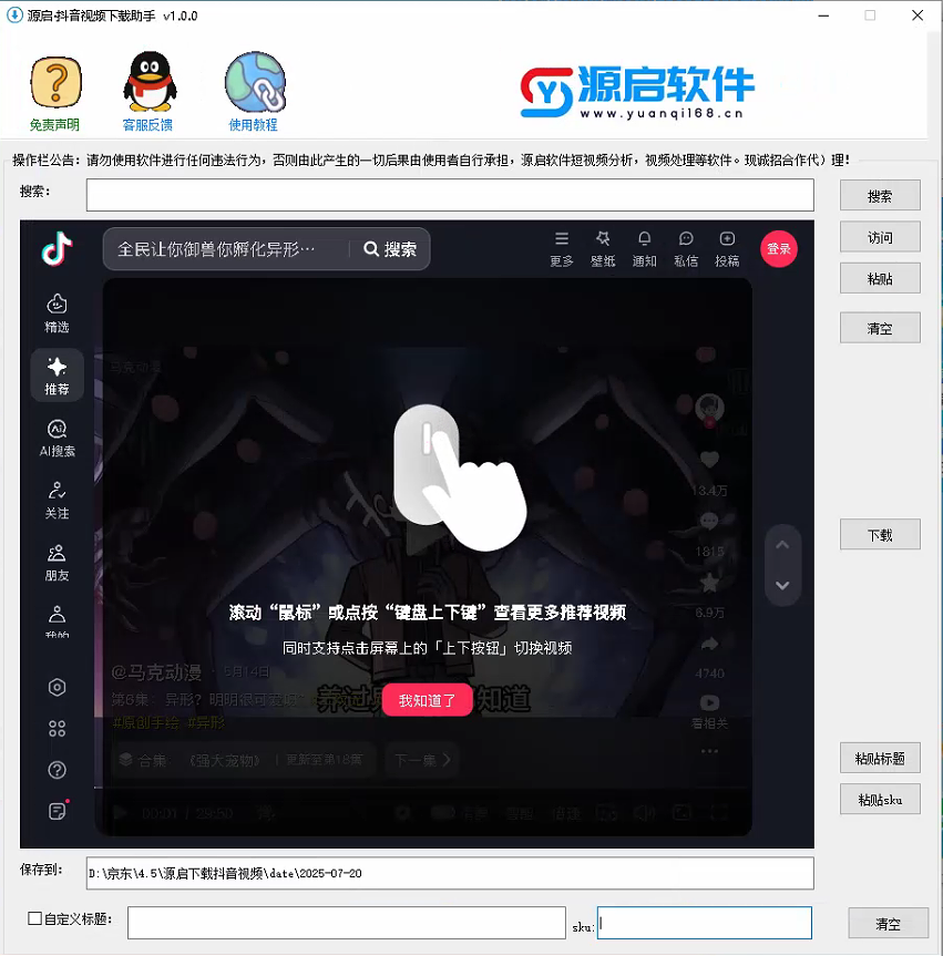 源启·抖音视频下载助手 v1.0.0 软件下载 下载软件 加入VIP 软件介绍源启软件(www.yuanqi168.cn)出品的抖音视频下载助手 ,主要功能有:边看边下,无水印,可自定义文件名称,无需点赞收藏,边看边下