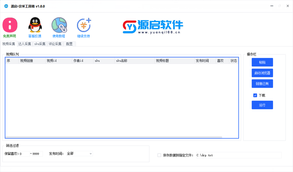 源启软件(www.yuanqi168.cn)出品的京采达人评,主要功能有:1.视频采集,通过京东站内视频链接,下载视频,分析视频包含的商品sku,分析发布作者id。2.达人采集,通过作者id采集作者发布的视频,批量下载。3.sku采集,通过一个sku采集商品其他skuid。4.评论采集,通过sku采集商品所属的评论视频和图片和商品图片,并批量下载